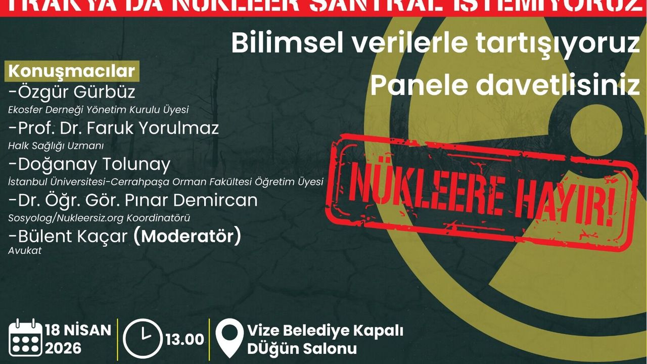 18 Nisan 2026 Cumartesi günü "Nükleere Hayır!" sloganıyla duyurulan panel saat 13.00’de Vize Belediyesi Kapalı Düğün Salonu’nda yapılacak. Panele tüm Trakya halkının katılımına açık olarak gerçekleştirilecek.