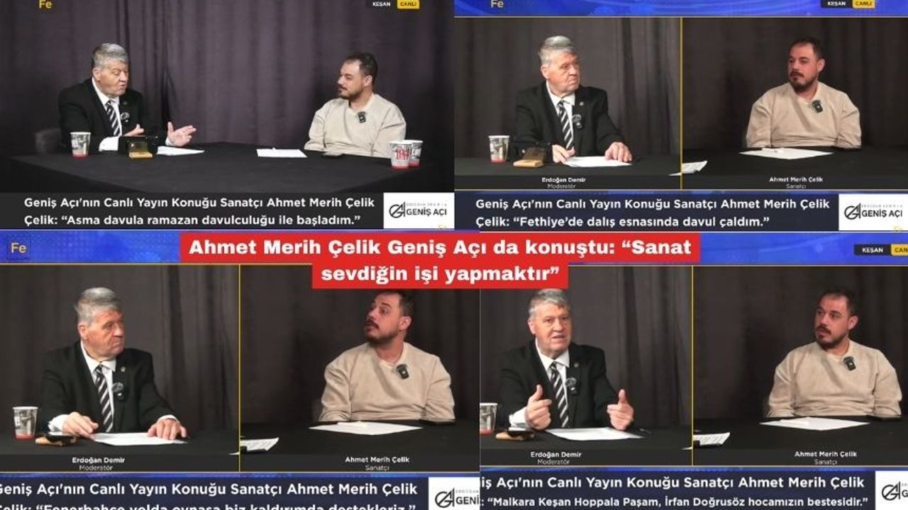 FE TV ekranlarında yayınlanan Geniş Açı programında Erdoğan Demir’in konuğu, Trakya’nın yetiştirdiği asma davul virtüözü ve sanatçı Ahmet Merih Çelik oldu. Kendini “Trakya’nın bağrından yetişen” biri olarak tanıttı.