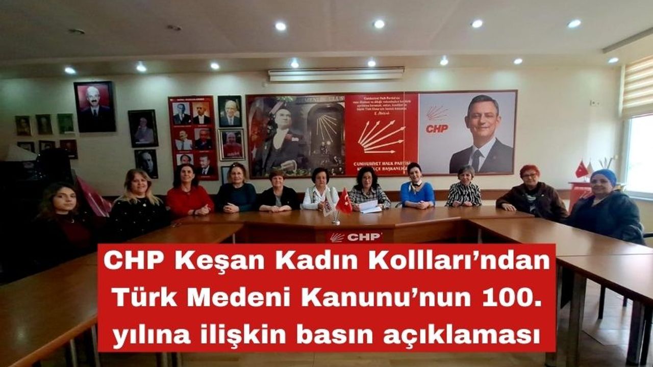 Cumhuriyet Halk Partisi Keşan Kadın Kolları Başkanı Emine Gegeoğlu, Kadın Kolları üyeleri ve Yönetim Kurulu üyeleri Cumhuriyet Halk Partisi Kadın Kolları Genel Başkanlığı tarafından Türk Medeni Kanunu’nun kabulünün 100. yılı dolayısıyla hazırlanan basın açıklamasını önceki gün saat 13.00’te parti binasında kamuoyuyla paylaştı.