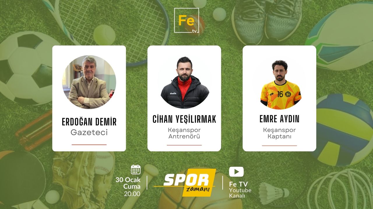 Fe TV’de Cuma akşamları saat 20.00’de canlı olarak sunulan Spor Zamanı Programı’nın bu akşamki konuğu Edirne Süper Amatör Amatör Lig takımlarından ilk yarıyı lider olarak bitiren Keşanspor Antrenörü Cihan Yeşilırmak ile Takım Kaptanı Emre Aydın olacak.