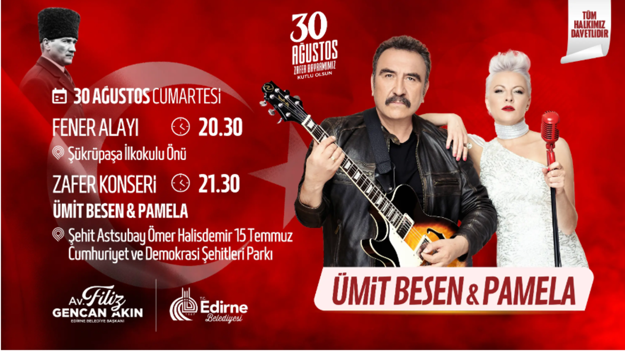 30 Ağustos Zafer Bayramı’nın 103. yıl dönümü, Edirne Belediyesi tarafından düzenlenen etkinliklerle coşku ve gurur içinde kutlanacak. Etkinlikler kapsamında Fener Alayı ve Zafer Konseri düzenlenecek. Ünlü sanatçılar Ümit Besen ve Pamela, Şehit Astsubay Ömer Halisdemir 15 Temmuz Cumhuriyet ve Demokrasi Şehitleri Parkı’nda Edirneliler ile buluşacak.