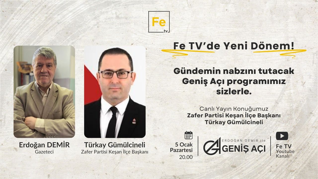 Fe TV’de Pazartesi akşamları saat 20.00’de canlı olarak yayınlanan ve Gazeteci Erdoğan Demir’in sunduğu Geniş Açı Programı’nın 05 Ocak Pazartesi günkü konuğu Zafer Partisi Keşan İlçe Başkanı Türkay Gümülcineli olacak.