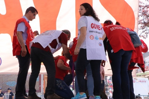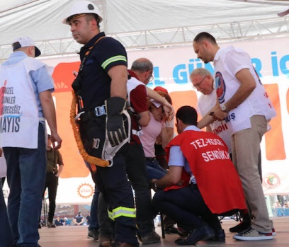 1 Mayıs Emek ve Dayanışma Günü Lüleburgaz ve Edirne'de kutlandı. Platformda bildiri okurken fenalaşan işçiye ilk müdahaleyi Edirne Belediye Başkanı Yardımcısı ve Edirne Tabip Odası Başkanı Ertuğrul Tanrıkulu yaptı. A.A.