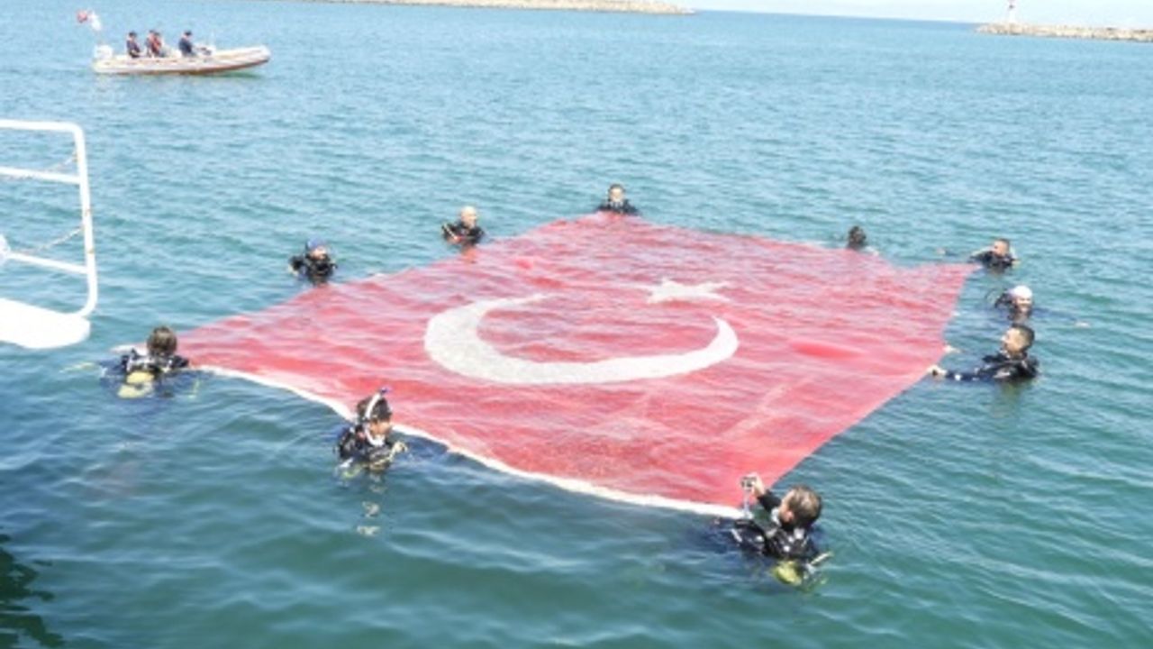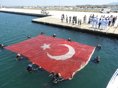Saros Körfezi'ne kıyısı olan Enez limanında, Denizcilik ve Kabotaj Bayramı etkinlikleri kapsamında dalgıçlar tarafından denizde dev Türk bayrağı açılarak, çelenk bırakıldı. DHA