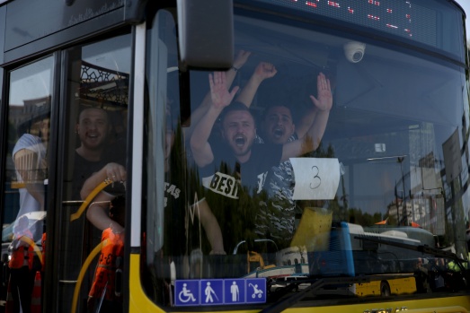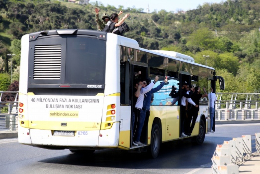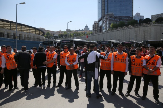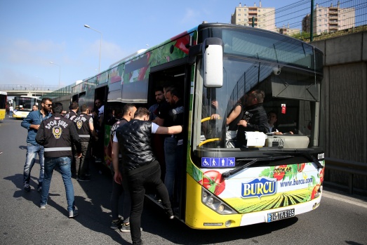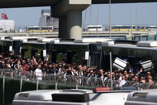 Beşiktaş taraftarları, Beşiktaş'ın Galatasaray'la oynayacağı Spor Toto Süper Lig maçı öncesi Vodafone park önünden bindikleri otobüslerle polis eşliğinde maçın oynanacağı Türk Telekom Stadı'na geldi. A.A.