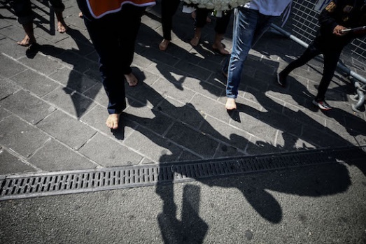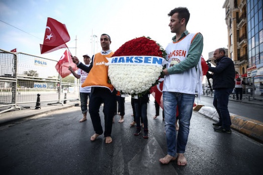 Kamu Çalışanları Hak Sendikaları Konfederasyonu (HAK-SEN) üyesi bir grup, 1 Mayıs Emek ve Dayanışma Günü'nde kamu çalışanlarının hak kayıplarına dikkati çekmek amacıyla çıplak ayakla Taksim Meydanı'na geldi. A.A.