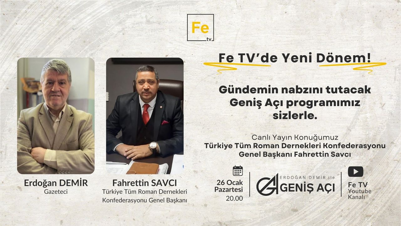 Fe TV’de Pazartesi akşamları saat 20.00’de canlı olarak yayınlanan ve Gazeteci Erdoğan Demir’in sunduğu Geniş Açı Programı’nın 26 Ocak’ta yayınlanacak bölümünün konuğu Türkiye Tüm Romanlar Dernekleri Konfederasyonu Genel Başkanı Fahrettin Savcı olacak.