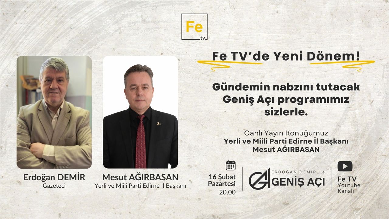 Fe TV’de Pazartesi akşamları saat 20.00’de canlı olarak yayınlanan ve Gazeteci Erdoğan Demir’in sunduğu Geniş Açı Programı’nın bu haftaki konuğu Milli ve Yerli Parti Edirne İl Başkanı Mesut Ağırbasan olacak.