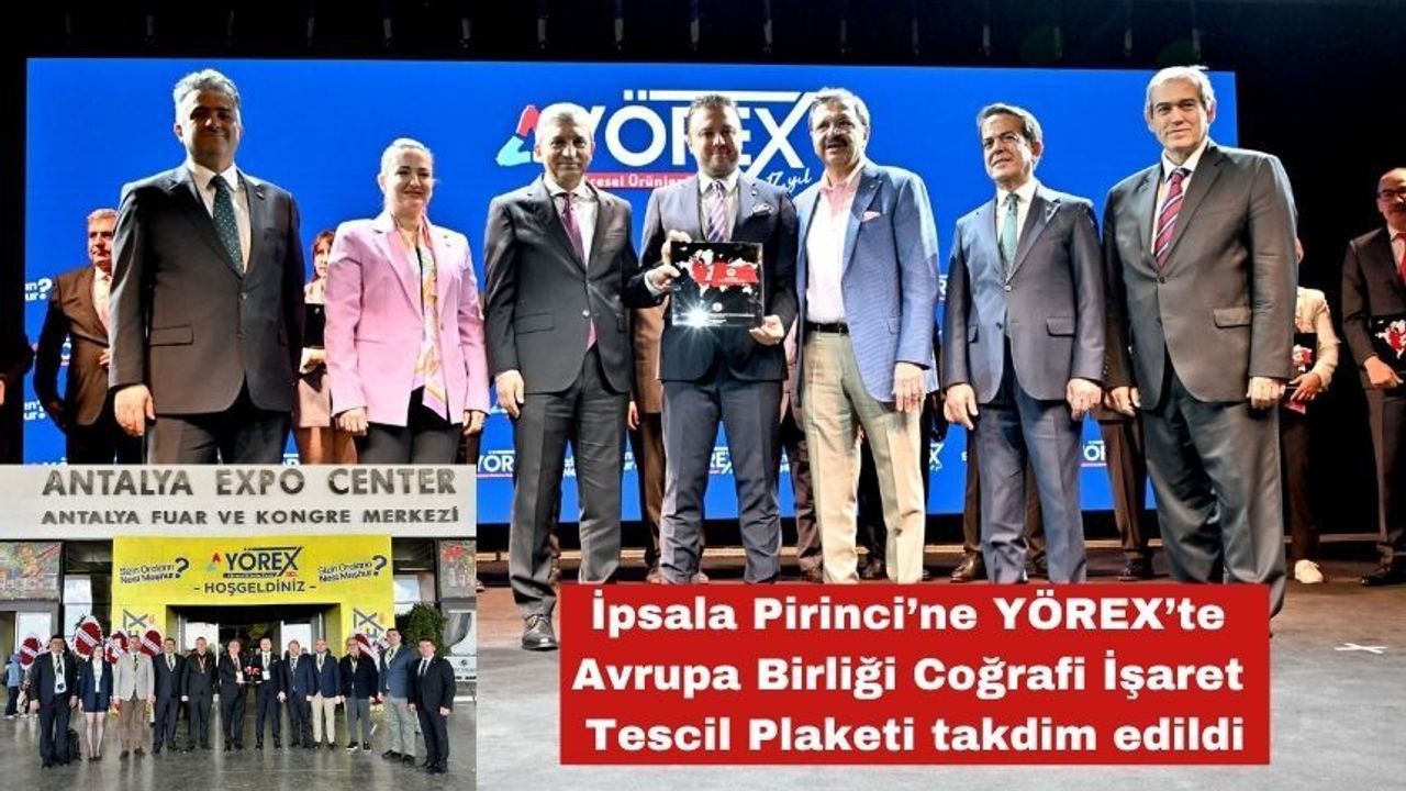 Keşan Ticaret ve Sanayi Odası(TSO) tarafından yürütülen çalışmalar neticesinde Avrupa Birliği Coğrafi İşaret Tescili alan İpsala Pirinci için, Antalya’da düzenlenen YÖREX Yöresel Ürünler Fuarı kapsamında 22 Nisan 2026 Çarşamba günü plaket takdim töreni gerçekleştirildi.