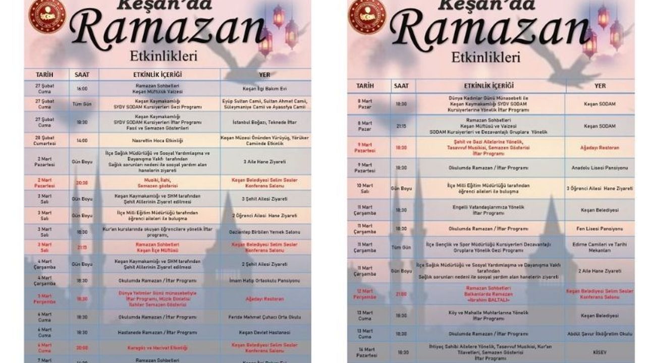 Keşan Kaymakamlığı tarafından organize edilen ve ilçede Ramazan ayının manevi iklimini en üst seviyede yaşatmayı hedefleyen etkinlik serisi dün itibarıyla başladı. 17 Mart 2026 Salı gününe kadar sürecek olan program, her kesimden vatandaşa hitap eden zengin bir içerikle sunuluyor.