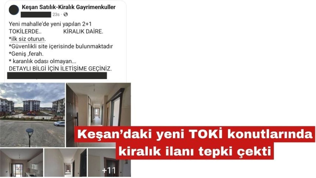 Keşan’da yeni yapılan TOKİ konutlarında dikkat çeken bir gelişme yaşandı. Konutları alan bir vatandaşın, dairesini teslim alır almaz kiralık ilanı vermesi kamuoyunda soru işaretlerine neden oldu. Sosyal medyada paylaşılan ilanda, yeni mahallede bulunan 2+1 dairenin “ilk siz oturun”, “güvenlikli site”, “geniş ve ferah” gibi ifadelerle pazarlanması dikkat çekti.