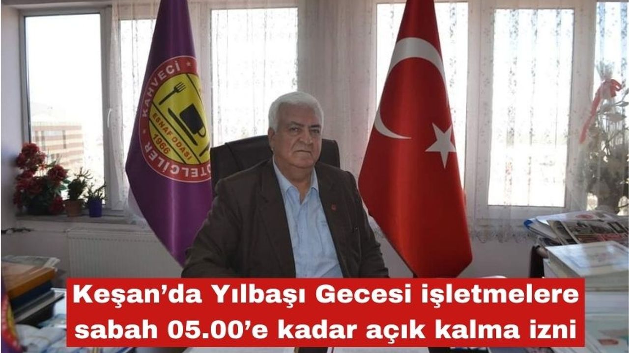 Keşan Lokantacı Kahveci ve Otelciler Esnaf Odası’nın girişimleriyle, yılbaşı gecesi umuma açık işletmelerin sabah 05.00’e kadar hizmet vermesine izin verildi. Karar, Keşan Belediye Encümeni tarafından onaylandı.