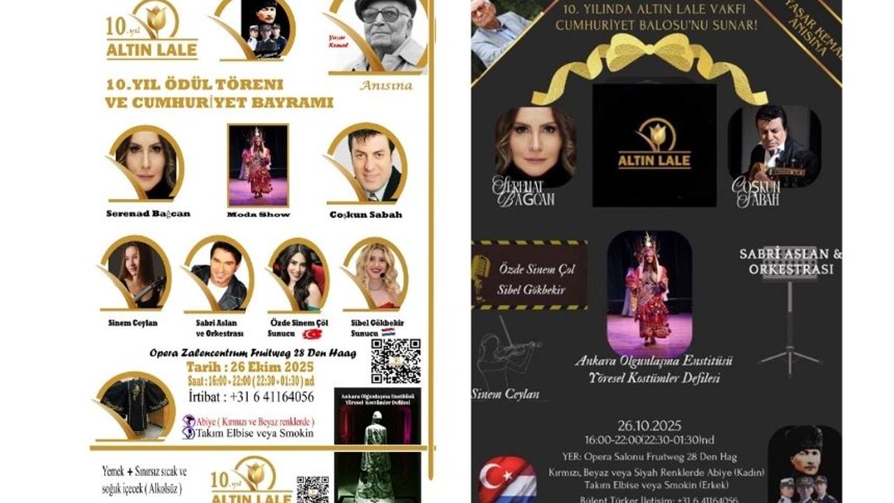 Cumhuriyet değerlerini yaşatmayı ve kültürel birliği pekiştirmeyi hedefleyen Altın Lale Vakfı, bu yıl 10. kuruluş yıldönümünü büyük bir coşku ve gururla Yaşar Kemal Anısına kutluyor. Her yıl geleneksel olarak düzenlenen Cumhuriyet Balosu ve Ödül Töreni, bu yıl 26 Ekim 2025 tarihinde Hollanda’nın Den Haag kentinde görkemli bir etkinlikle gerçekleşecek.