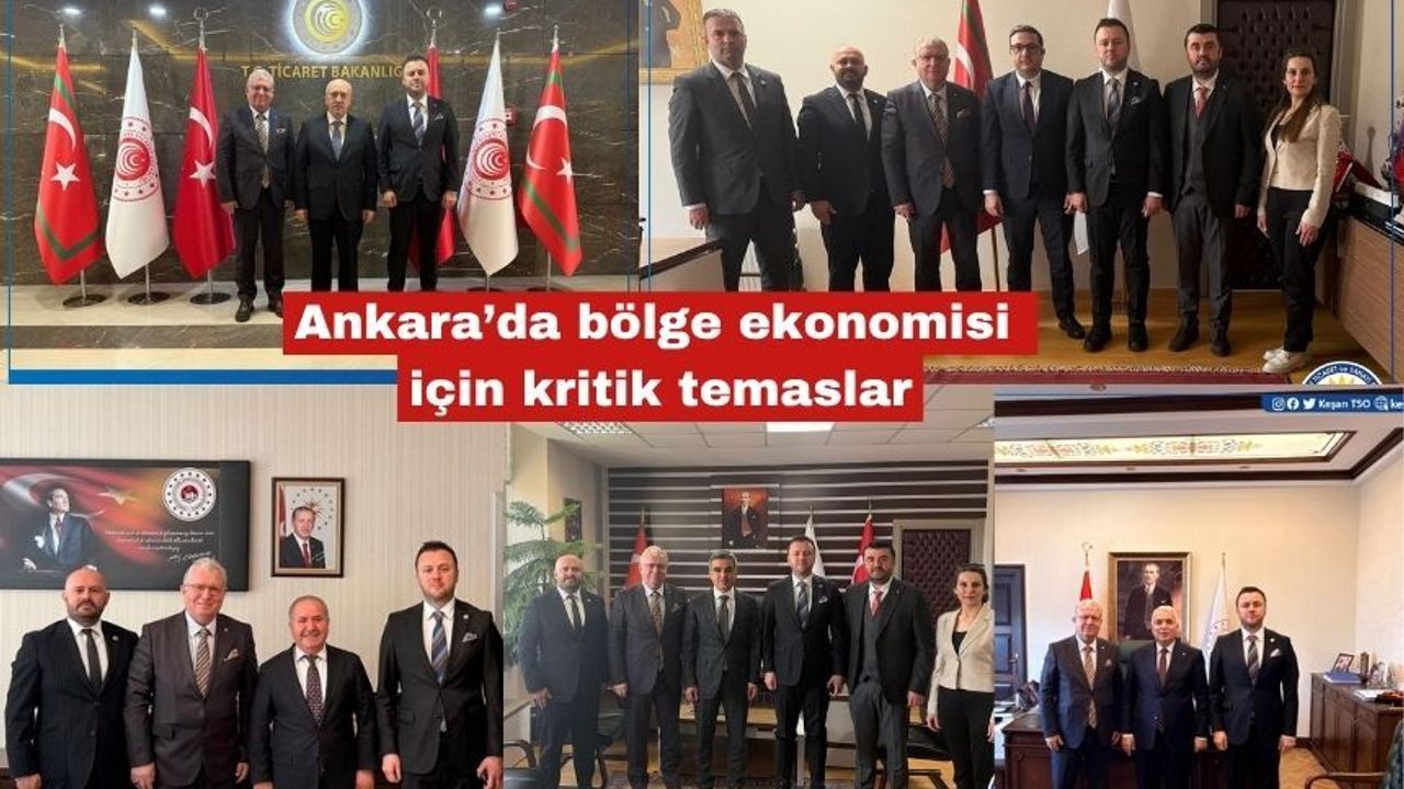 Bölge ekonomisinin lokomotifi olan Oda ve Borsa başkanları, Ankara’da yoğun bir ziyaret trafiği gerçekleştirdi. Keşan TSO ve İpsala UMAT Başkanı İsmail Şapçı, Uzunköprü TSO Başkanı İsmail Akalın ve Tekirdağ TB Başkanı Osman Sarı’dan oluşan heyet, ticaretin hızlandırılması ve bölgesel gelişim için kilit kurumlarla bir araya geldi.
