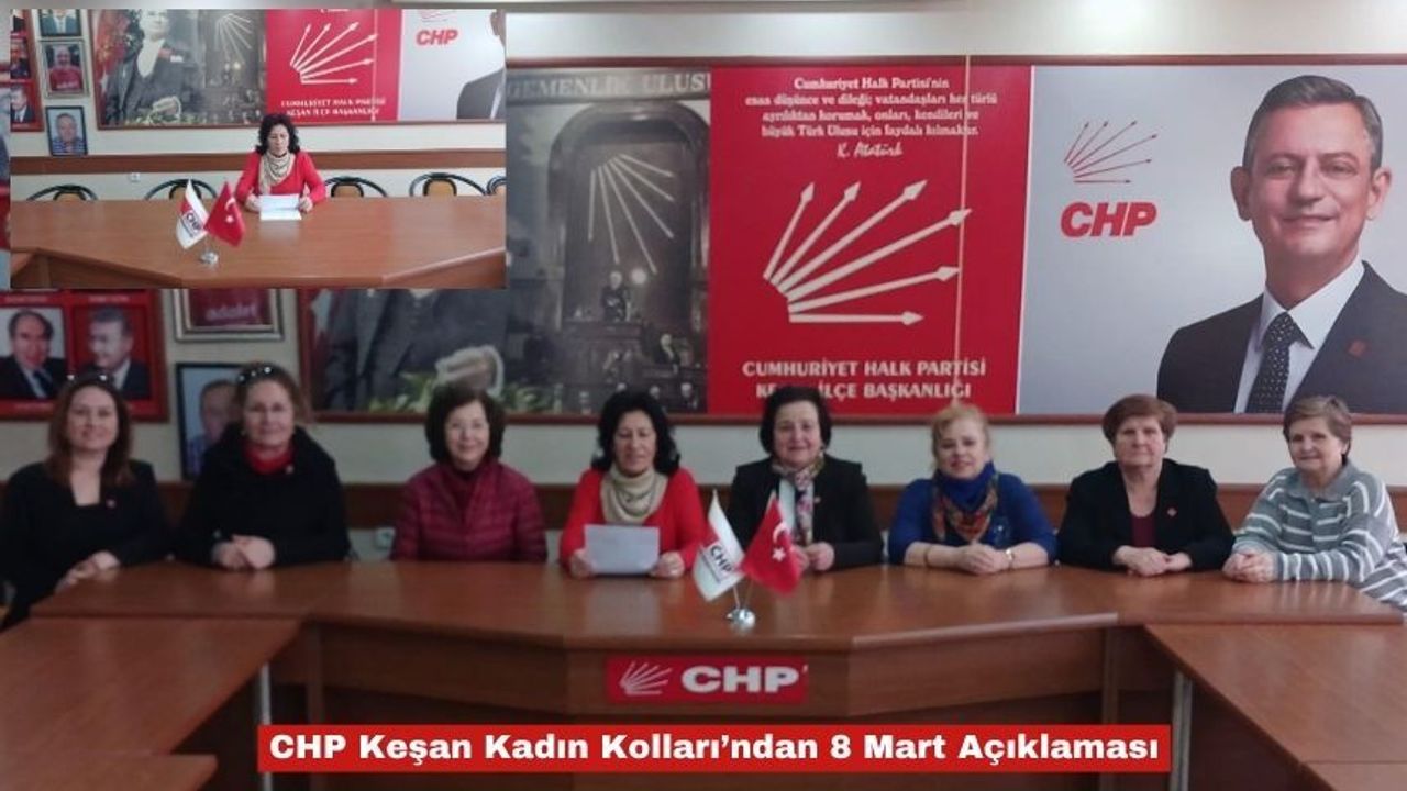 Cumhuriyet Halk Partisi Keşan Kadın Kolları, 8 Mart Dünya Emekçi Kadınlar Günü dolayısıyla parti binasında ortak bir basın açıklaması gerçekleştirdi. Kadın Kolları Başkanı Emine Gegeoğlu, Yönetim Kurulu üyeleri ve Kadın Kolları üyelerinin katılımıyla yapılan açıklamada, kadınların yaşam hakkı, eşitlik mücadelesi ve sosyal adalet talepleri vurgulandı.