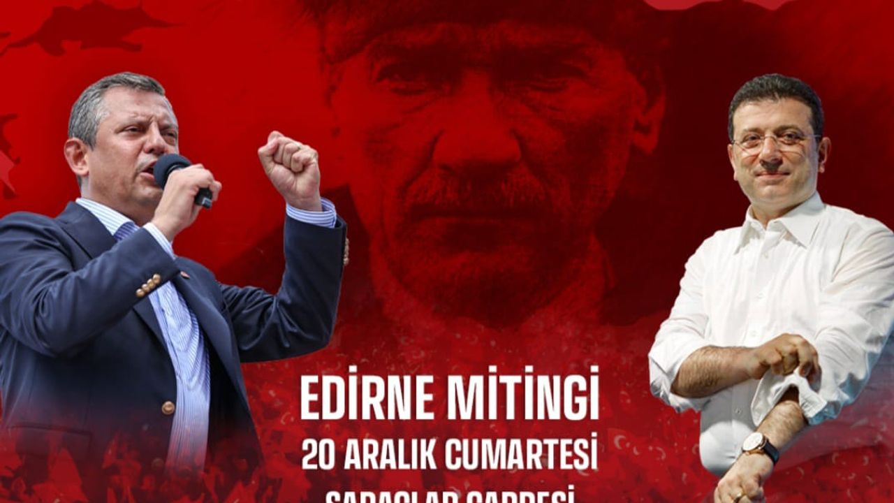 Cumhuriyet Halk Partisi (CHP) Genel Başkanı Özgür Özel, “Millet İradesi’ne Sahip Çıkıyor” sloganıyla düzenlenecek miting kapsamında 20 Aralık Cumartesi günü saat 13.30’da Edirne Saraçlar Caddesi’nde halka seslenecek.