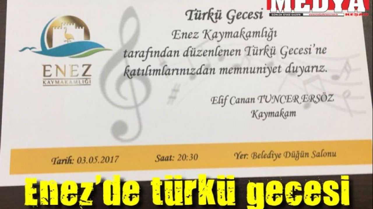 Enez Kaymakamlığı bu akşam “Türkü Gecesi” düzenliyor. Enez Kaymakamı Elif Canan Tuncer Ersöz Enez Belediye Düğün Salonunda saat 20.30’da başlayacak olan geceye türkü severleri davet etti.