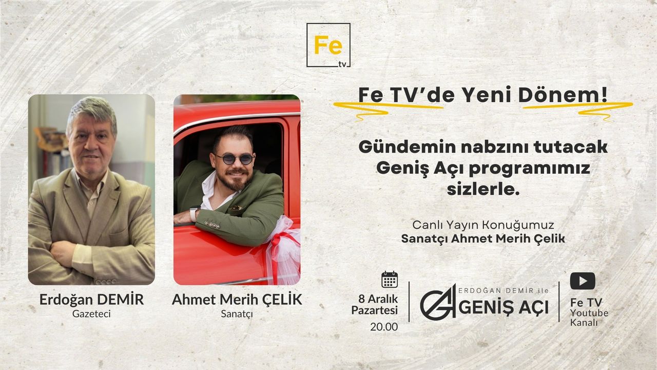 Fe TV’de Pazartesi akşamları saat 20.00’de canlı olarak yayınlanan ve Gazeteci Erdoğan Demir’in sunduğu Geniş Açı Programı’nın bu akşamki konuğu sanatçı ve asma davul virtiözü Ahmet Merih Çelik olacak.