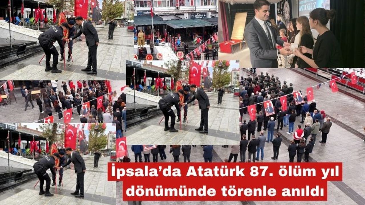 İpsala’da, Gazi Mustafa Kemal Atatürk’ün ebediyete irtihalinin 87. yıl dönümü dolayısıyla Cumhuriyet Meydanı’nda düzenlenen törende çelenk sunuldu, saygı duruşunda bulunuldu ve İstiklal Marşı okundu. Törene ilçe protokolü, öğrenciler ve vatandaşlar katıldı.