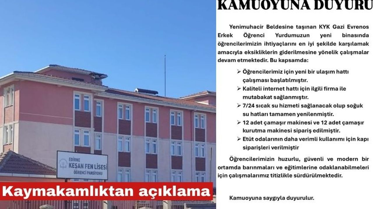 Keşan’da öğrencilerin barınma sorunlarıyla gündeme gelen Gazi Evrenos Erkek Öğrenci Yurdu hakkında, Keşan Kaymakamlığı sosyal medya hesapları üzerinden açıklama yapıldı.