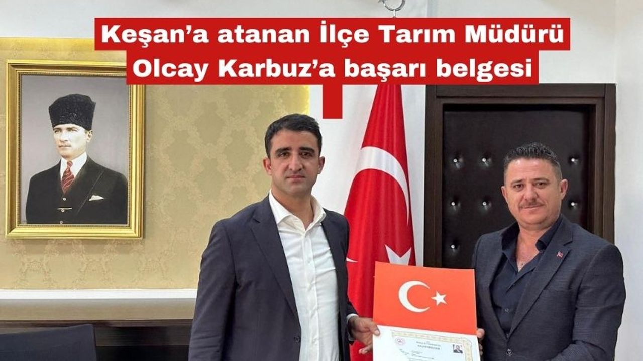 “İpsala’mızda çeltik sulaması konusunda gösterdiği başarılı çalışmalardan ve Keşan İlçesine Müdür olarak atanmasından dolayı Tarım Müdürümüz Olcay Karbuz’u başarı belgesiyle ödüllendirdik. Yeni görev yerinde başarılarının devamını diliyoruz.”