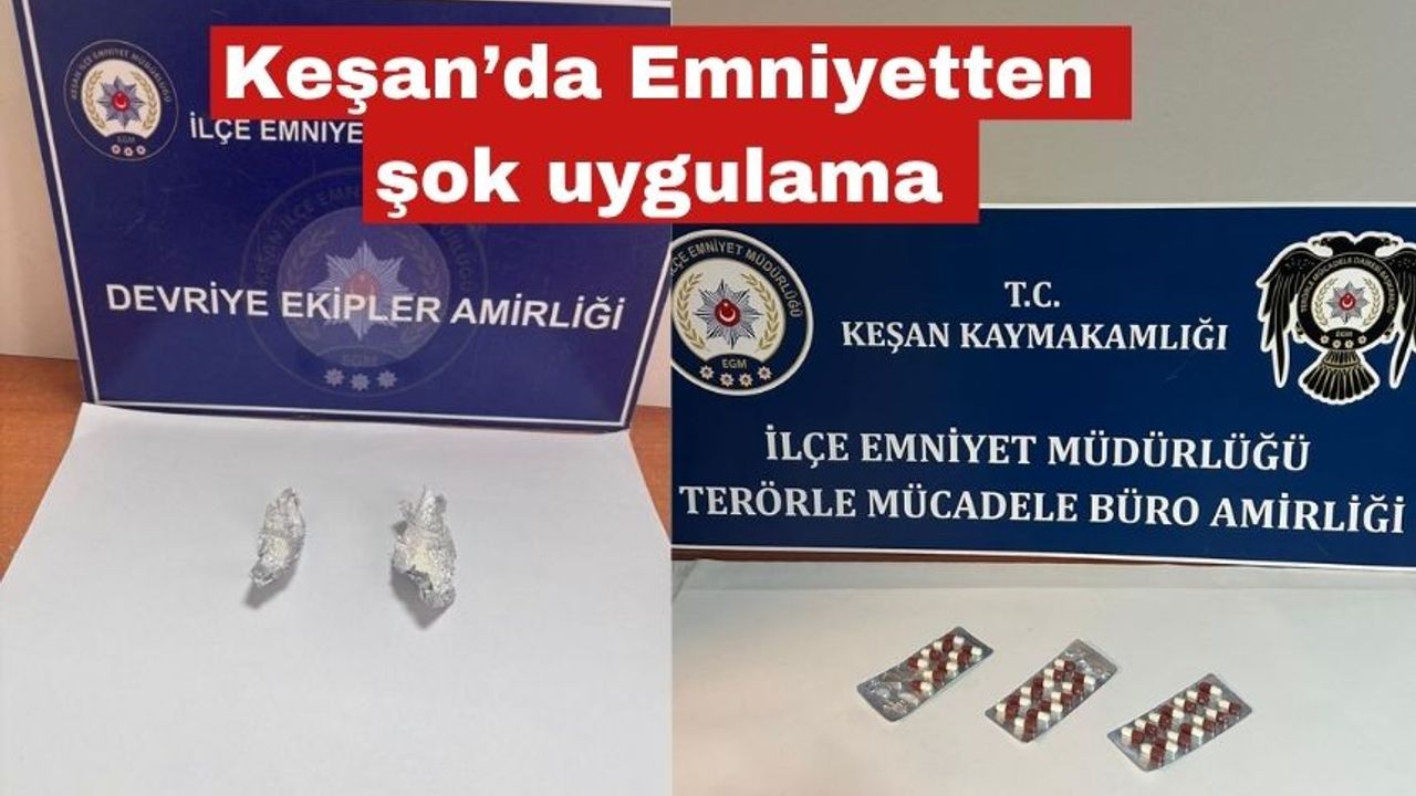 Keşan İlçe Emniyet Müdürlüğü ekipleri tarafından 22 Ekim 2025 tarihinde 11:00-17:00 saatleri arasında gerçekleştirilen şok uygulamalarda çeşitli suçlardan aranan şahıslar yakalanırken, uyuşturucu madde ele geçirildi.
