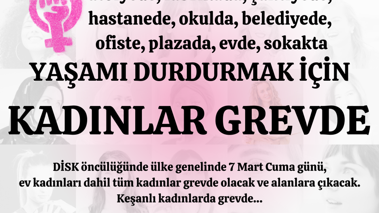 DİSK öncülüğünde, Türkiye genelinde 7 Mart 2025 Cuma günü gerçekleştirilecek olan “Yaşamı Durdurmak İçin Kadınlar Grevde” eylemine Keşanlı kadınlar da katılıyor. Ev kadınları da dahil olmak üzere tüm kadınların greve çıkacağı eylem, Keşan Belediyesi Çok Amaçlı Pazaryeri Kompleksi’nde saat 12.00’de başlayacak.