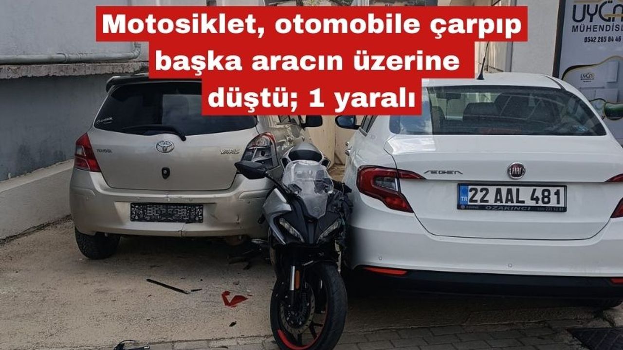 Keşan’da otomobile çarpıp, 2 aracın ortasına sıkıştıktan sonra başka otomobilin üzerine düşen motosikletin sürücüsü H.B.A. (51), yaralandı. Kaza, öğle saatlerinde İspat Cami Mahallesi Hıdırağa Sokak'ta meydana geldi. H.B.A. yönetimindeki 22 AEC 908 plakalı motosiklet, T.A. idaresindeki 22 AES 957 plakalı otomobille çarpıştı. H.B.A.'nın kontrolünü kaybettiği motosiklet daha sonra yol kenarında park halinde bulunan iki otomobilin ortasında sıkıştı. H.B.A., sıkışan motosikletten fırlayarak park halindeki başka bir otomobilin üzerine düşüp yaralandı. İhbarla olay yerine polis ve sağlık ekipleri sevk edildi. H.B.A. ambulansla kaldırıldığı Keşan Devlet Hastanesi'nde tedaviye alındı. H.B.A.'nın durumunun iyi olduğu bildirildi. Kazayla ilgili inceleme sürüyor