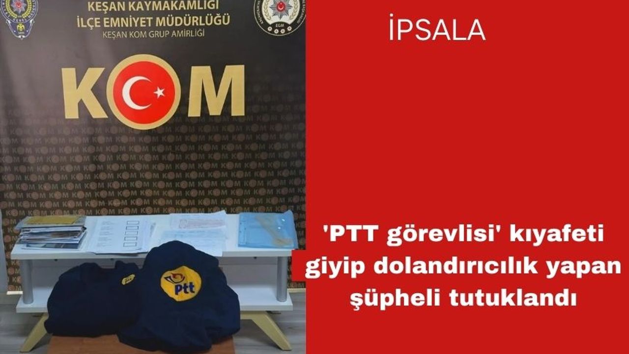 Edirne'nin İpsala ilçesinde, PTT görevlisi kıyafeti giyip, kargo teslimi bahanesiyle vatandaşların attıkları imzaları boş senetlere geçirdiği iddia edilen Tayfun B., gözaltına alındı. İl Emniyet Müdürlüğü Keşan Kaçakçılık ve Organize Suçlarla Mücadele Amirliği ile İpsala Emniyet Müdürlüğü ekiplerinin ortak yürüttüğü çalışmada, 'Dolandırıcılık' ve 'Sahtecilik' suçlarından kaydı bulunan Tayfun B.'nin, PTT görevlisi kıyafeti giyip belli adreslere gittiği ve hazırladığı tertibatla vatandaşların kargo teslim tutanağına attıkları imzaları boş senetlere geçirdiği tespit edildi. Tayfun B., polis ekipleri tarafından gözaltına alındı. Evindeki aramada, üzerinde 'PTT' ibaresi bulunan mont ve kazak, teslim tutanaklarının altına yerleştirilmiş boş senetler ve üzeri doldurulmuş senetler ele geçirilen Tayfun B.’nin emniyetteki işlemleri sürüyor.