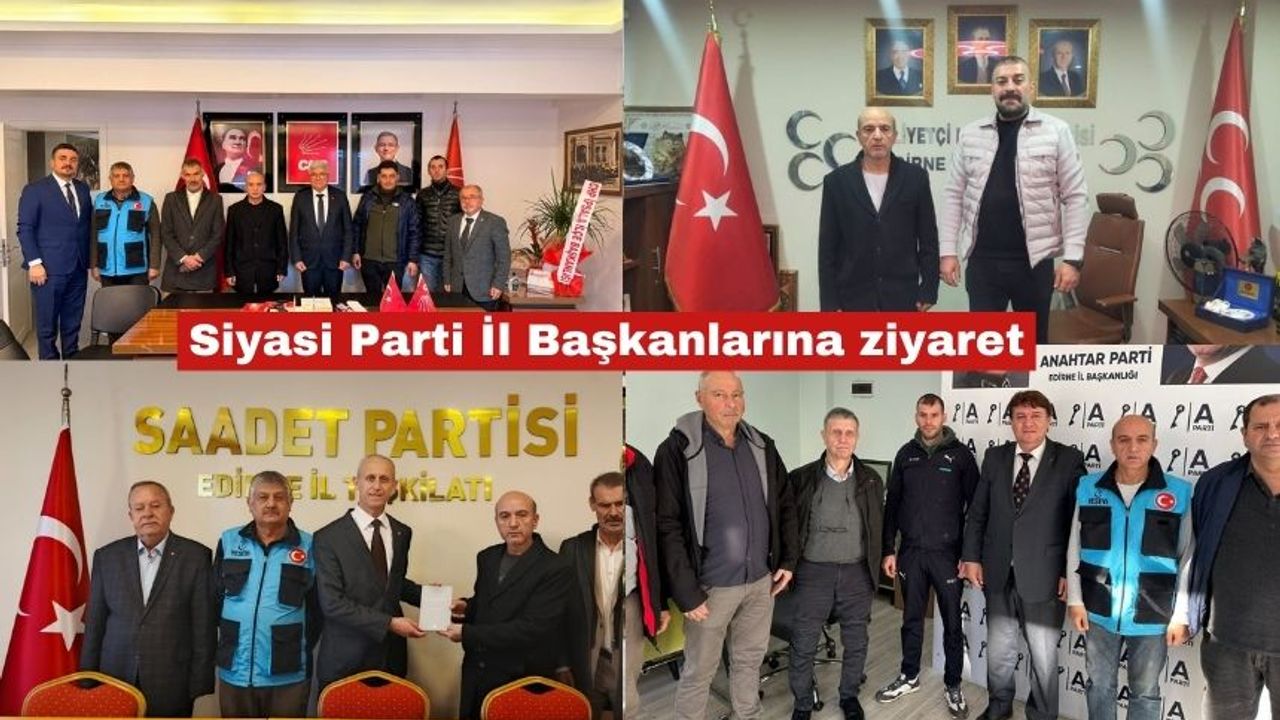 Gerçekleştirilen ziyaretler kapsamında Dernek Başkanı Alpaslan Cankaloğlu ve beraberindeki heyet; CHP Edirne İl Başkanı Yücel Balkanlı, MHP Edirne İl Başkanı Emre Tokluoğlu, Saadet Partisi Edirne İl Başkanı Tezcan Karakütük, Anahtar Parti Edirne İl Başkanı Erdinç Balıkçı ile Yeniden Refah Partisi Edirne İl Başkanı Hakan Çalışkan’ı parti il başkanlıklarında ziyaret etti.