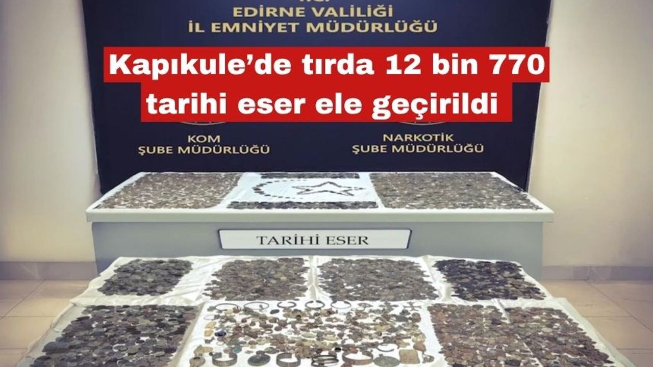 İl Emniyet Müdürlüğü Kaçakçılık ve Organize Suçlarla Mücadele ile Narkotik Suçlarla Mücadele Şube Müdürlüğü ekipleri, Konya'dan Polonya'ya giden TIR'ı çıkış yapmak üzere geldiği Kapıkule Sınır Kapısı'nda detaylı aramaya aldı. Aramada, TIR'ın kupa kısmında farklı boyut ve ebatlarda 12 bin 370 sikke ile 400 çeşitli takı ve obje olmak üzere toplam 12 bin 770 parça tarihi eser ele geçirildi. Yurt dışına kaçırılmak istendiği belirlenen tarihi eserlerle ilgili TIR'ın sürücüsü gözaltına alındı.