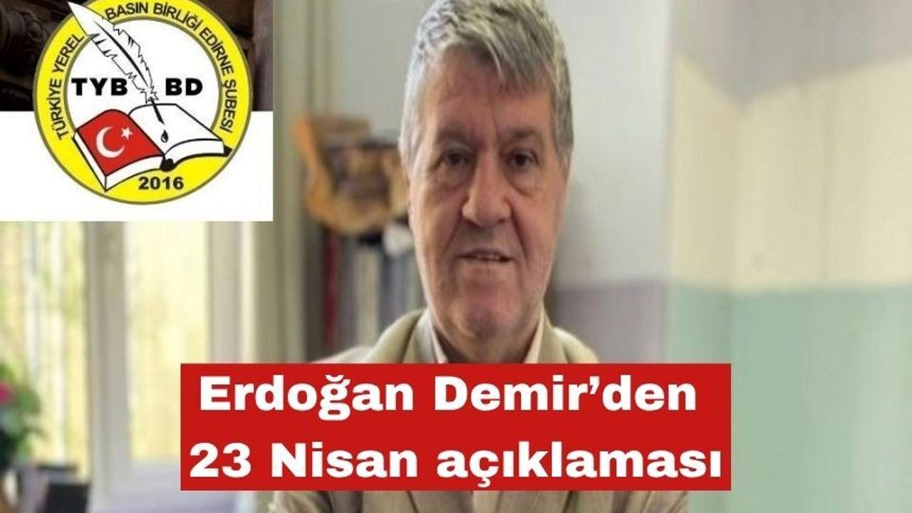 Türkiye Yerel Basın Birliği (TYBB) Edirne Şube Başkanı Erdoğan Demir, 23 Nisan Ulusal Egemenlik ve Çocuk Bayramı nedeniyle yazılı bir mesaj yayımladı. Demir, yarının büyükleri olan çocuklara daha güçlü, daha güzel, daha yaşanabilir bir Türkiye bırakmak için çaba gösterdiklerini ifade etti.