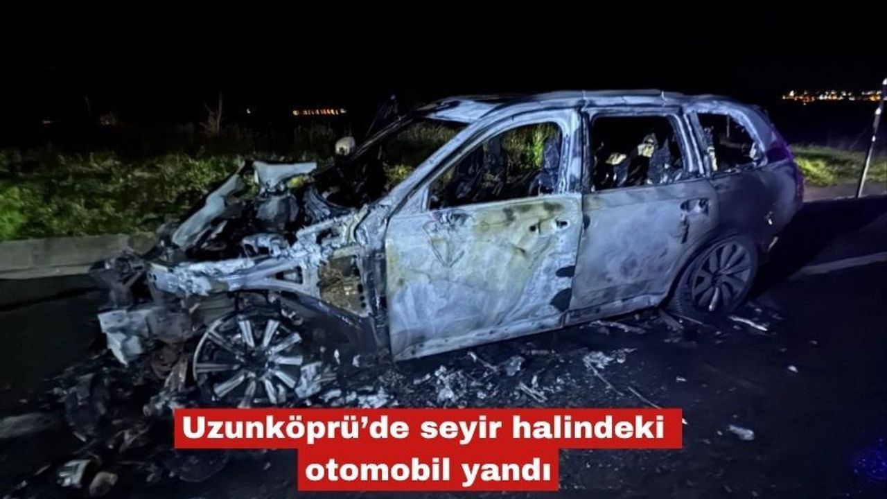 Uzunköprü ilçesinde seyir halindeki otomobil yanarak kullanılamaz hale geldi. Olay, önceki akşam saatlerinde Uzunköprü-Edirne kara yolu üzerindeki Yeniköy Mahallesi’nde meydana geldi. Uzunköprü’den Edirne yönüne giden K.Ş. (52) yönetimindeki 06 EUV 075 plakalı otomobil Yeniköy Mahallesi’ne geldiği sırada iddiaya göre elektrik kontağından dolayı motor kısmından alev alarak, yanmaya başladı. Durumu fark eden sürücü, otomobili durdurarak dışarı çıktı. Alevler kısa sürede tüm otomobili sararken, ihbar üzerine olay yerine polis, jandarma ve itfaiye ekipleri sevk edildi. Yangın, itfaiye ekiplerinin müdahalesiyle söndürüldü. Yangın sonucu otomobil kullanılamaz hale getirildi. Olayla ilgili inceleme başlatıldı. (DHA)