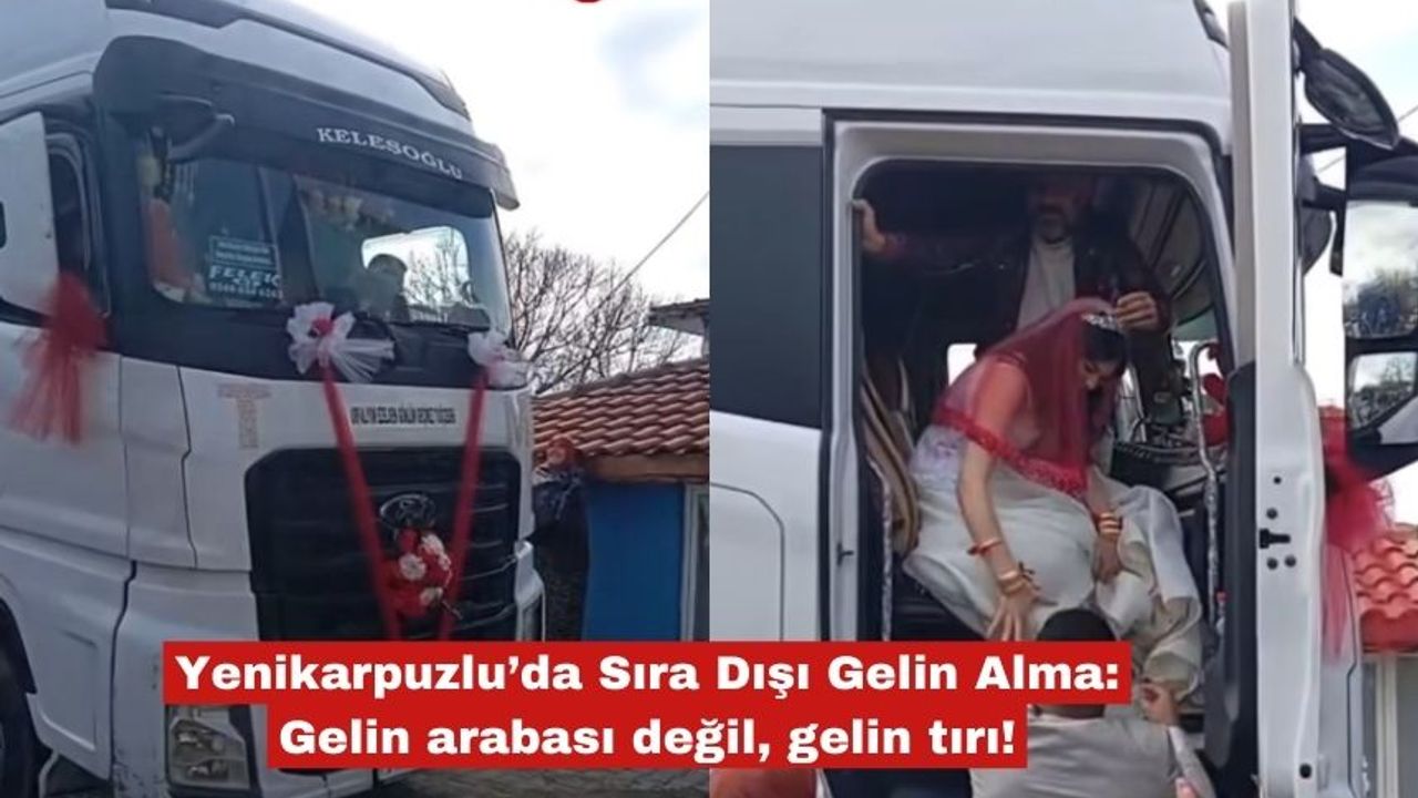 Yenikarpuzlu beldesi, alışılmışın dışında bir gelin alma törenine sahne oldu. Tır şoförlüğü yapan damadın mesleğine olan tutkusunu en mutlu gününe taşımasıyla ortaya